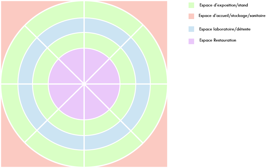 L’aménagement global de l’espace serait circulaire pour permettre à tous les chemins de culminer vers un point central qui est celui du partage et de la restauration. Cette disposition met en avant le bien-être du visiteur qui pourra profiter pleinement de sa balade. Entre deux zones d’exposition, il y aurait les espaces labo, qui permettraient au visiteur de s’ouvrir l’esprit et d’innover. Aux extrémités du plan, ces espaces seraient réservés à l’accueil, aux sanitaires et au stockage.