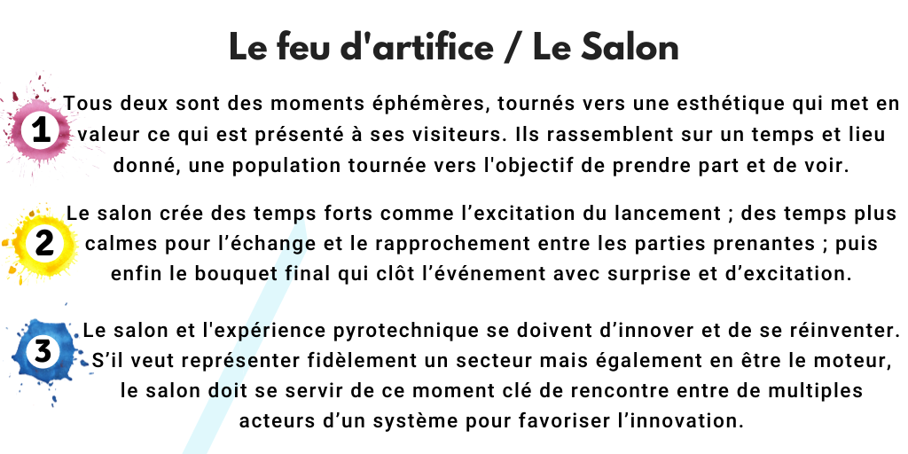 Enfin, le feu d’artifice est un moment de partage et de rencontre. Il réunit pendant quelques instants toute une population autour d’un moment clé. Il favorise l’échange entre les participants, laisse le souvenir d’un émerveillement. En somme, il est un rituel pour acter un événement important. Le salon peut également remplir ces objectifs, en réunissant des acteurs d’une filière à un moment et lors d’un temps donné. Aussi éphémère soit-il, il s’agit d’un moment économique d’importance où des contacts professionnels sont noués, des commandes sont passées, où le professionnel peut rencontrer sa clientèle et sa concurrence, le tout dans un petit écosystème.