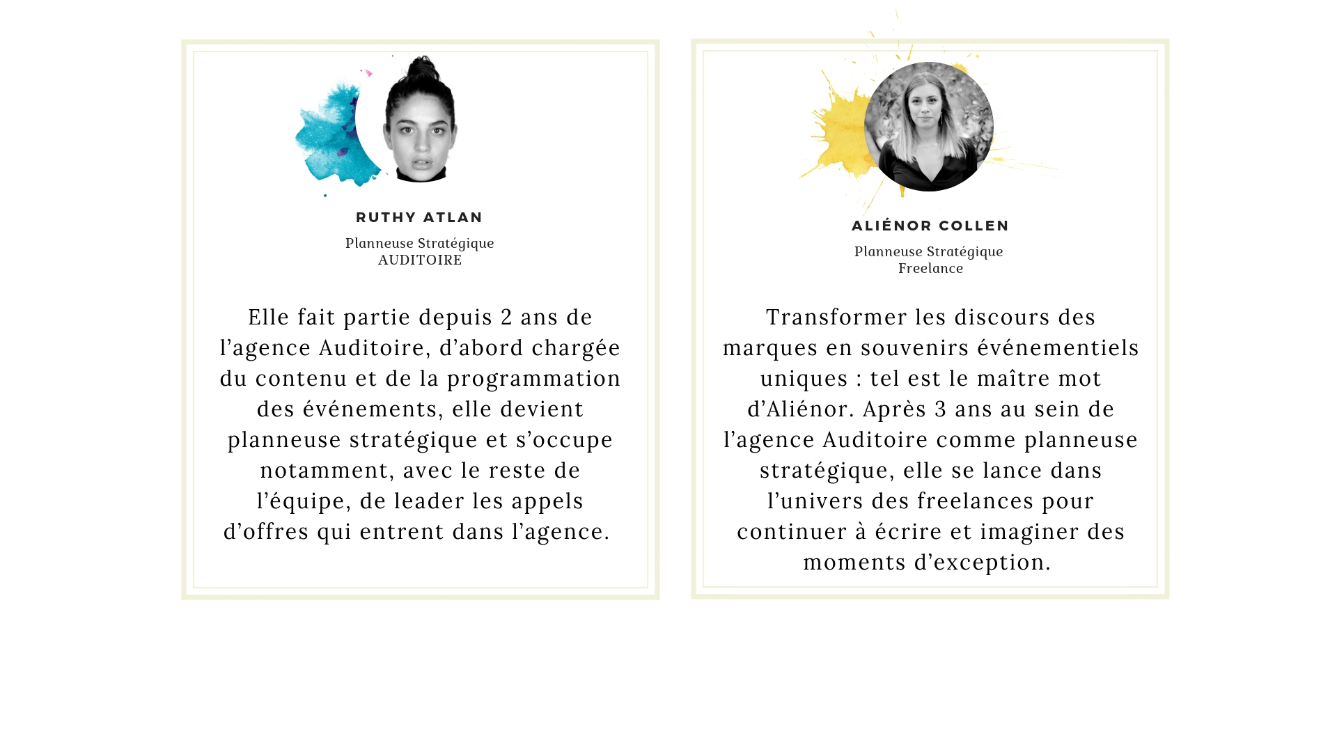 Nous avons rencontré Ruthy Atlan et Aliénor Collen, planneuses stratégiques chez Auditoire, une agence d’expérience de marque qui crée des événements centrés sur l’expérience émotionnelle et l’inattendu. Elles nous racontent leur quotidien, nouent un lien entre créativité et sens et nous livrent leurs sources d’inspiration.