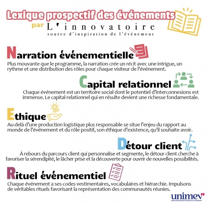 Détour client ? Capital relationnel ? Rituel événementiel ? L’Innovatoire vous propose son lexique prospectif des événements, un indispensable pour quiconque souhaite comprendre ce vocabulaire propre à la filière événementielle.