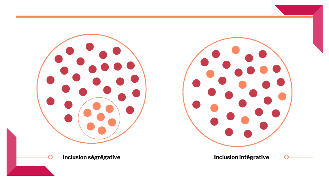 Plus précisément, l’inclusion est une notion de participation sociale qui se divise en deux visions : l’inclusion ségrégative et l’inclusion intégrative (l’inclusion que l’on cherche à atteindre).