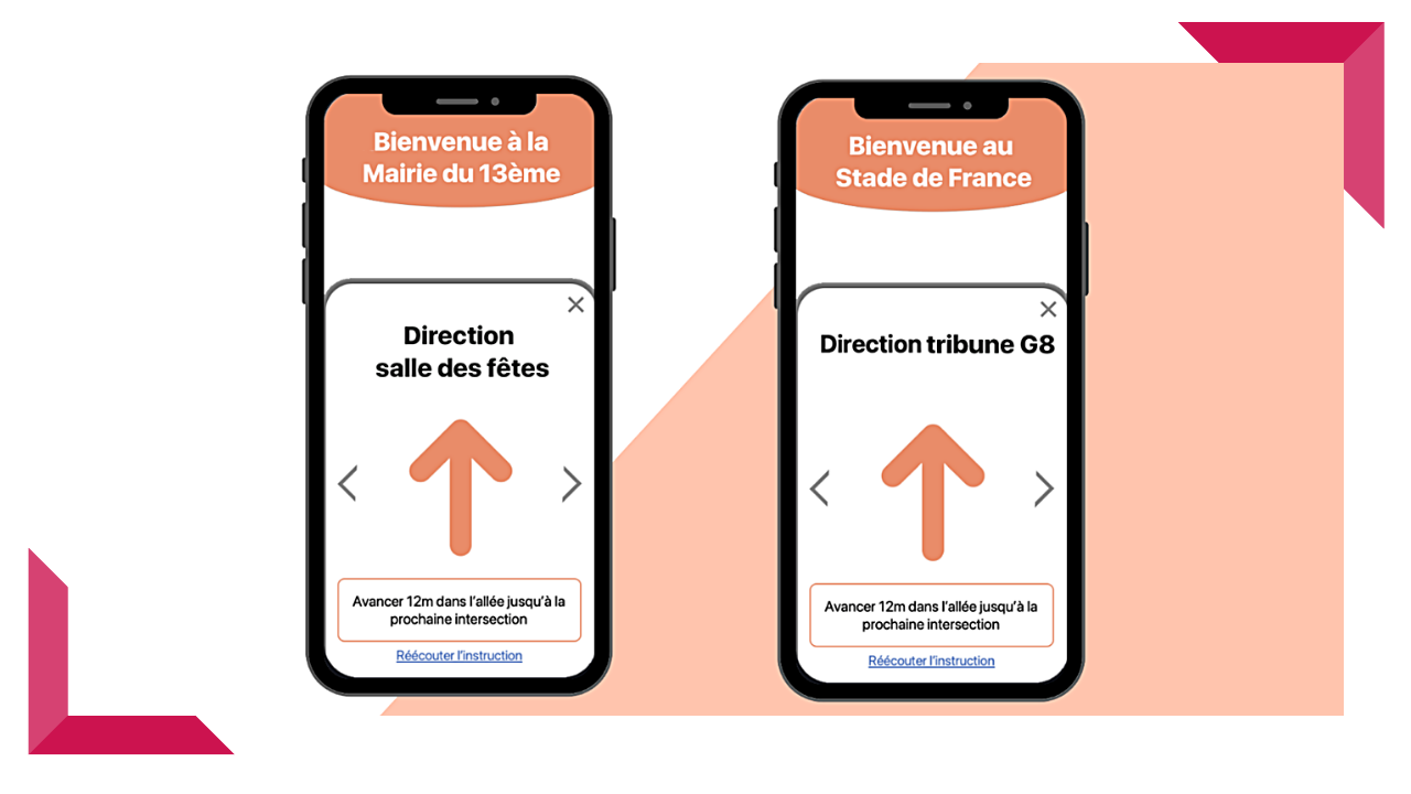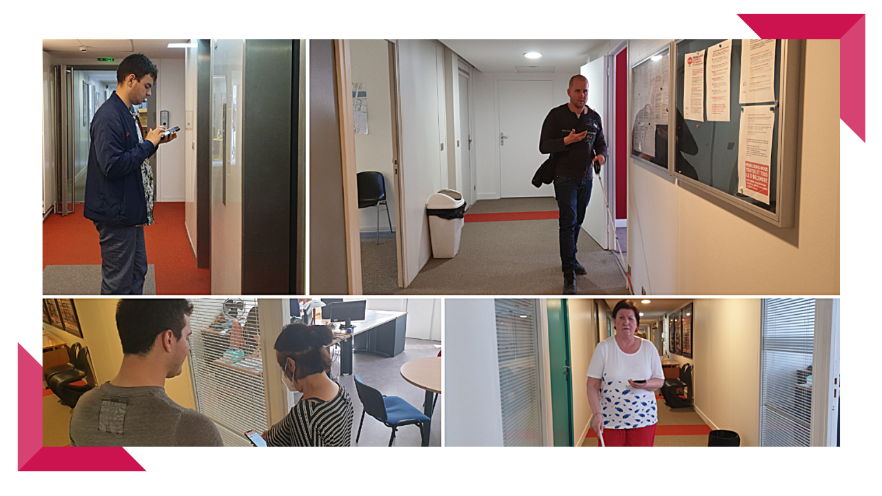 Elles se traduisent notamment par des fonctionnalités de guidage pas-à-pas en indoor. En effet, grâce à un travail de cartographie et de recensements des divers points d’intérêt (sanitaire, accueil, stand, espace de conférences etc.), nous sommes capables de guider une personne déficiente visuelle d’un point A à un point B, de rassurer une personne déficiente cognitive dans son parcours grâce à la méthode FALC (Facile à Lire et à Comprendre) et d’amener une personne utilisatrice d’un fauteuil roulant jusqu’à un ascenseur qui fonctionne.