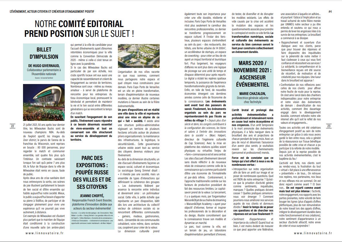 Pages 22 et 23 de la Revue Annuelle #4 de L’Innovatoire / Le Comité éditorial prend position sur le sujet « L’événement, acteur citoyen et créateur d’engagement ».