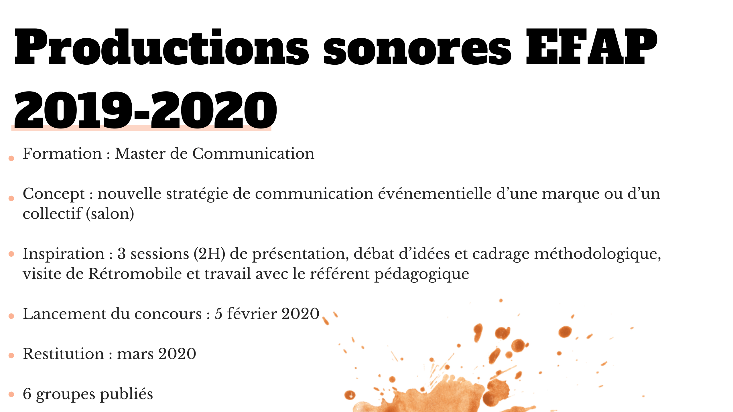 En prenant pour exemple des événements existants ou fictifs, les groupes d’étudiants ont travaillé sur les différentes temps de la communication (avant, pendant, après), pour enfin décliner leur réflexion sous format podcast. Les notions d’engagement, d’éthique, d’émotion à faire passer et bien d’autres sont alors abordées.